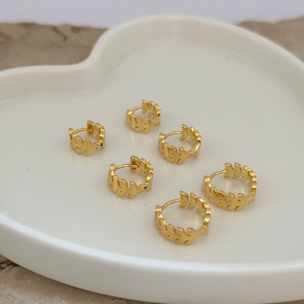 Complete seu look com elegância e estilo com este trio de brincos de argola inspirados na delicadeza da folha de louro. Um conjunto versátil e moderno, ideal para diferentes ocasiões.