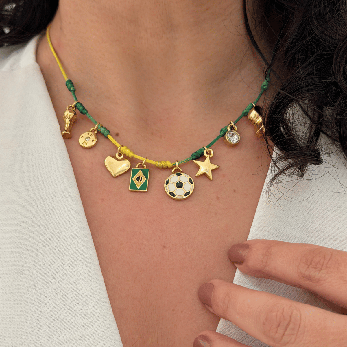 Colar confeccionado em fio de cetim com nós decorativos e pingentes inspirados no Brasil, trazendo identidade, estilo e originalidade à peça. Com 40 cm de comprimento, é ideal para destacar o colo e complementar produções modernas e descontraídas. Versátil, pode ser usado sozinho ou em combinações, perfeito para quem busca um acessório diferenciado com toque cultural e contemporâneo.