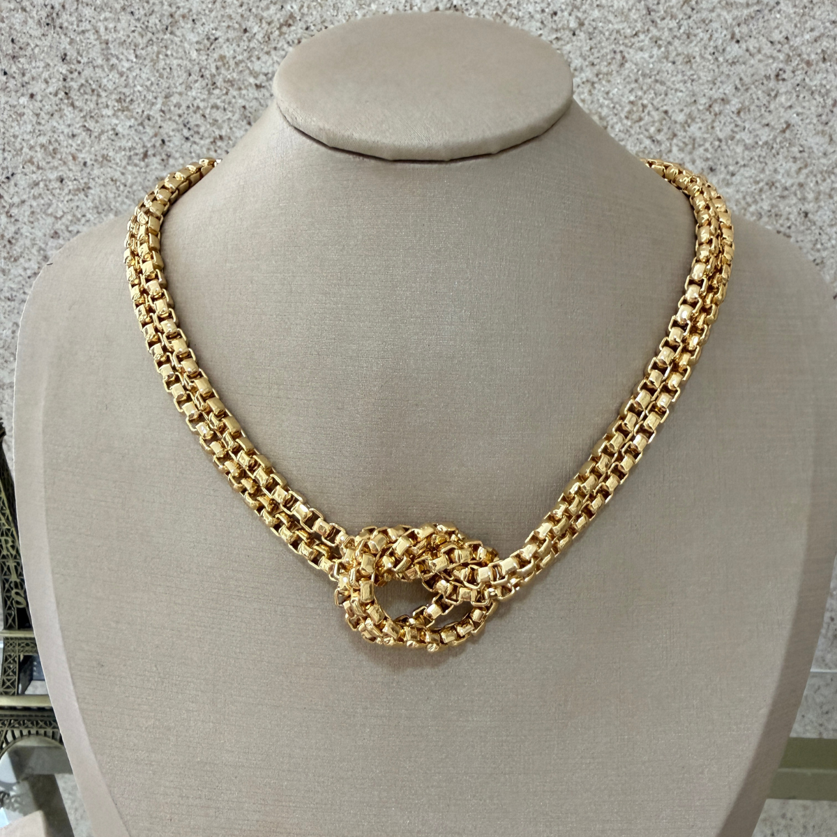 Moderno e elegante, este colar de 40cm no estilo veneziano grosso duplo é a escolha ideal para quem busca um acessório marcante e sofisticado. Seu design com duas correntes traz mais presença ao visual, enquanto o detalhe central em nó adiciona charme e significado à peça.