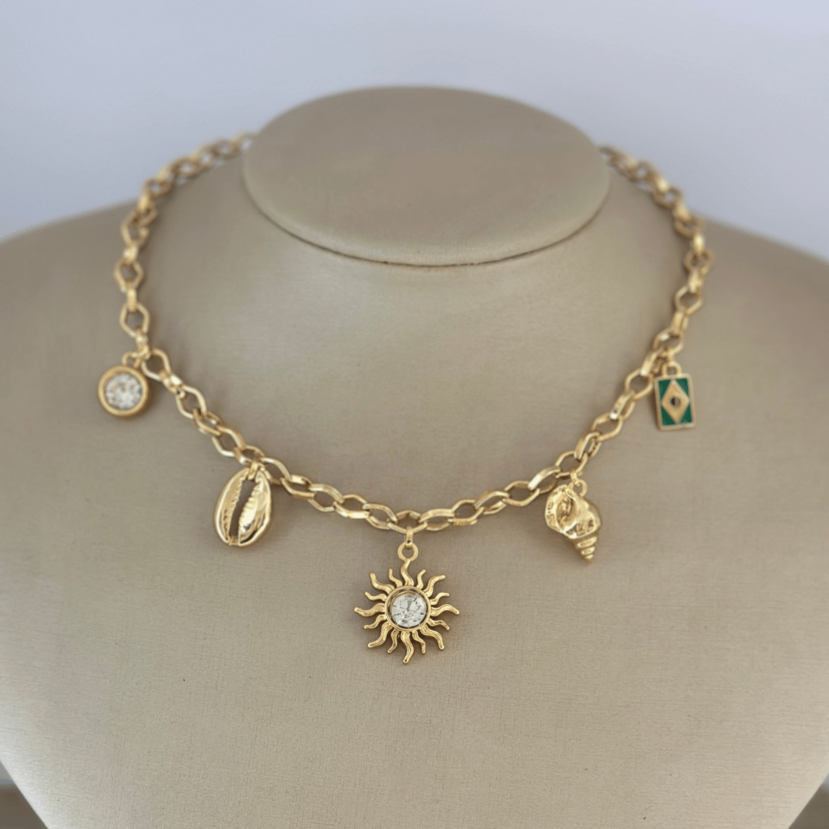 Celebre o verão o ano todo com este colar encantador, que traz berloques temáticos de Brasil, Sol e Praia. O comprimento de 45 cm garante caimento elegante no pescoço, perfeito para usar sozinho ou em sobreposição com outros colares. A corrente de elos clássica oferece resistência e versatilidade, enquanto os berloques adicionam personalidade e diversão ao look.