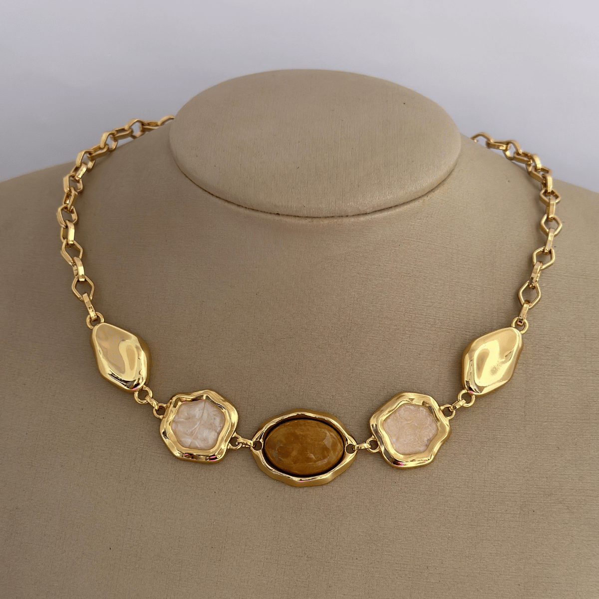 O colar Elo Corrente de 45cm traz um design moderno e sofisticado, valorizado por pedras orgânicas em formato irregular, que refletem a beleza e a autenticidade da natureza. Cada detalhe torna essa peça única e cheia de personalidade.