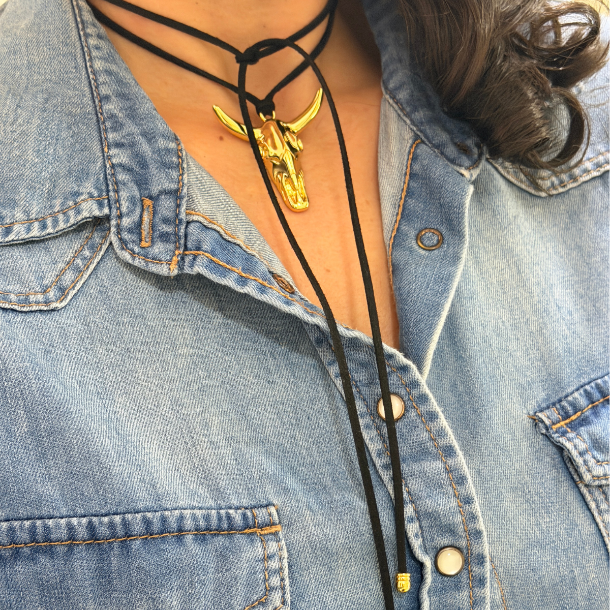 Dê um toque de estilo rústico e sofisticado ao seu look com o nosso colar regulável em camurça. Este acessório apresenta um elegante pingente em forma de cabeça de boi, que traz um charme único e autêntico.