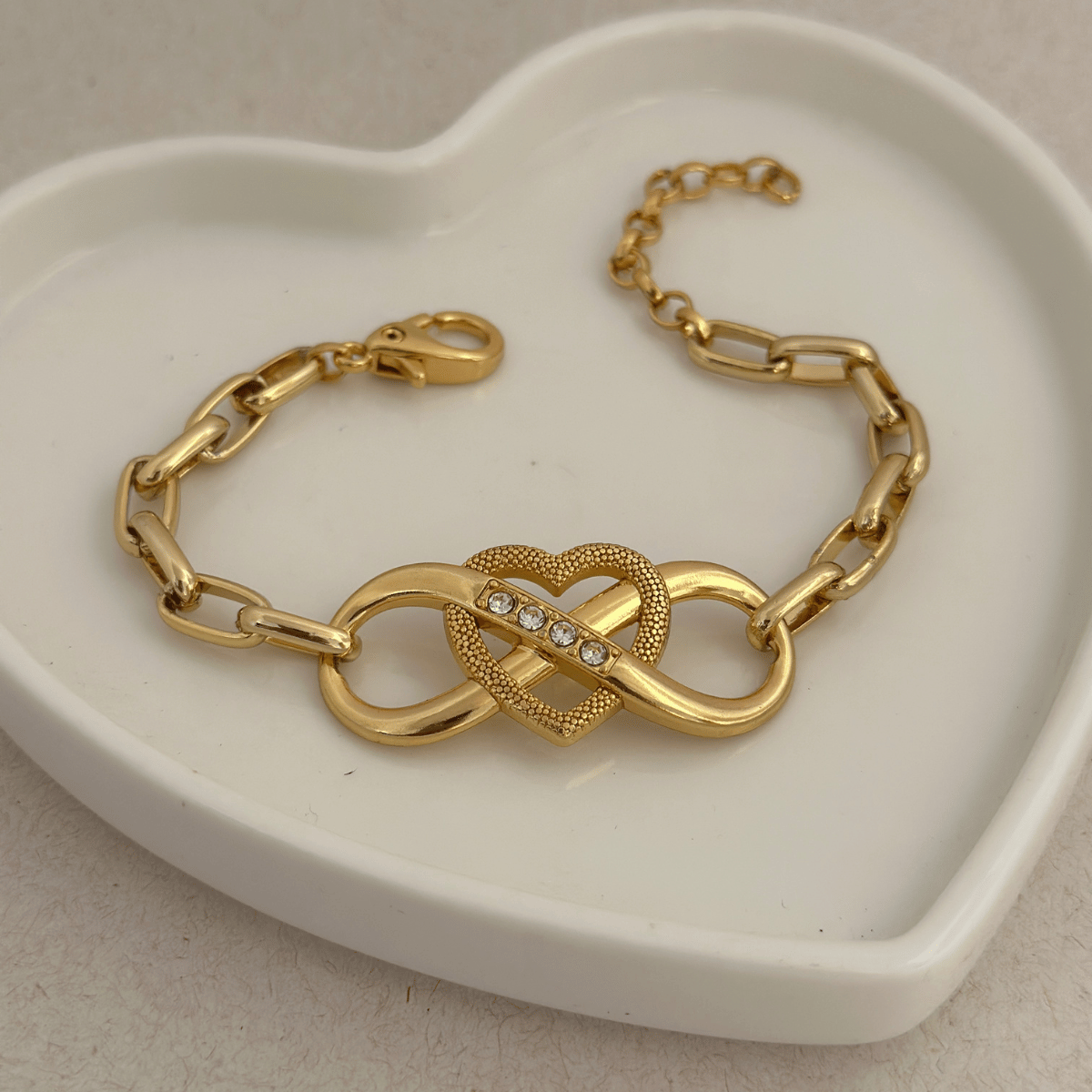 A pulseira Elo Kartier é conhecida por seu estilo marcante e elegante, e ganha ainda mais charme com o pingente de infinito e coração, representando amor, união e conexão sem fim.