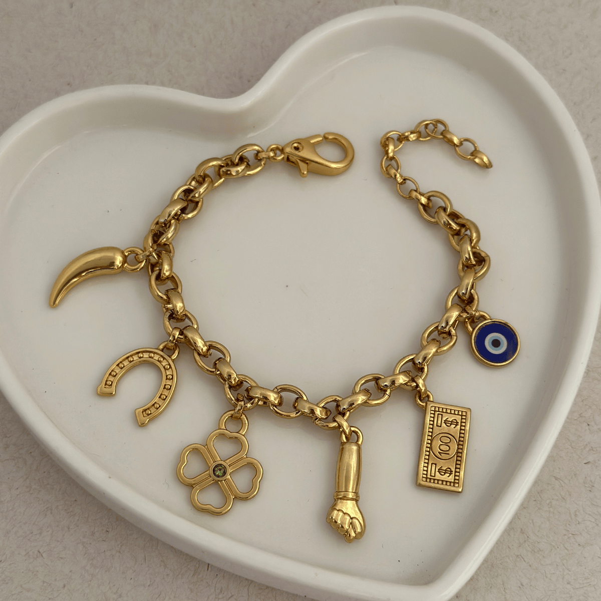 A pulseira Elo Português é um clássico que nunca sai de moda, e nesta versão especial vem acompanhada de berloques inspirados em símbolos de sorte e proteção, como olho grego, trevo e figa — perfeitos para quem acredita no poder das boas vibrações.